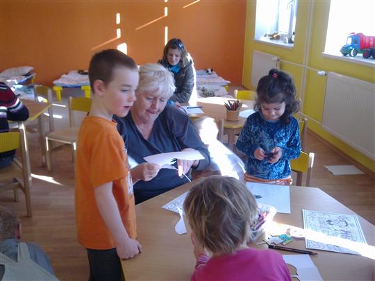 Děti ukazují paní Novotné namalované obrázky.